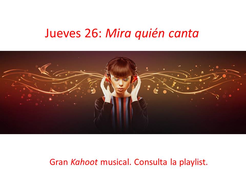 El día 26, seguimos celebrando la música en los Jueves de la Biblioteca. Ven al salón de actos y participa en el nuestro Kahoot musical con TEMAZOS de ayer y de hoy. Habrá sorpresas para l@s más rápid@s. Documéntate. Haz click. Consulta la playlist.